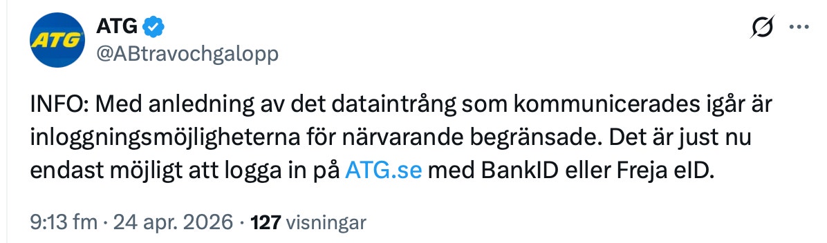 Spelbolaget ATG har tillfälligt begränsat sina inloggningsmöjligheter efter larmet om ett misstänkt dataintrång. Enligt ett uttalande på X är det i nuläget endast inloggning via BankID eller Freja eID som gäller.