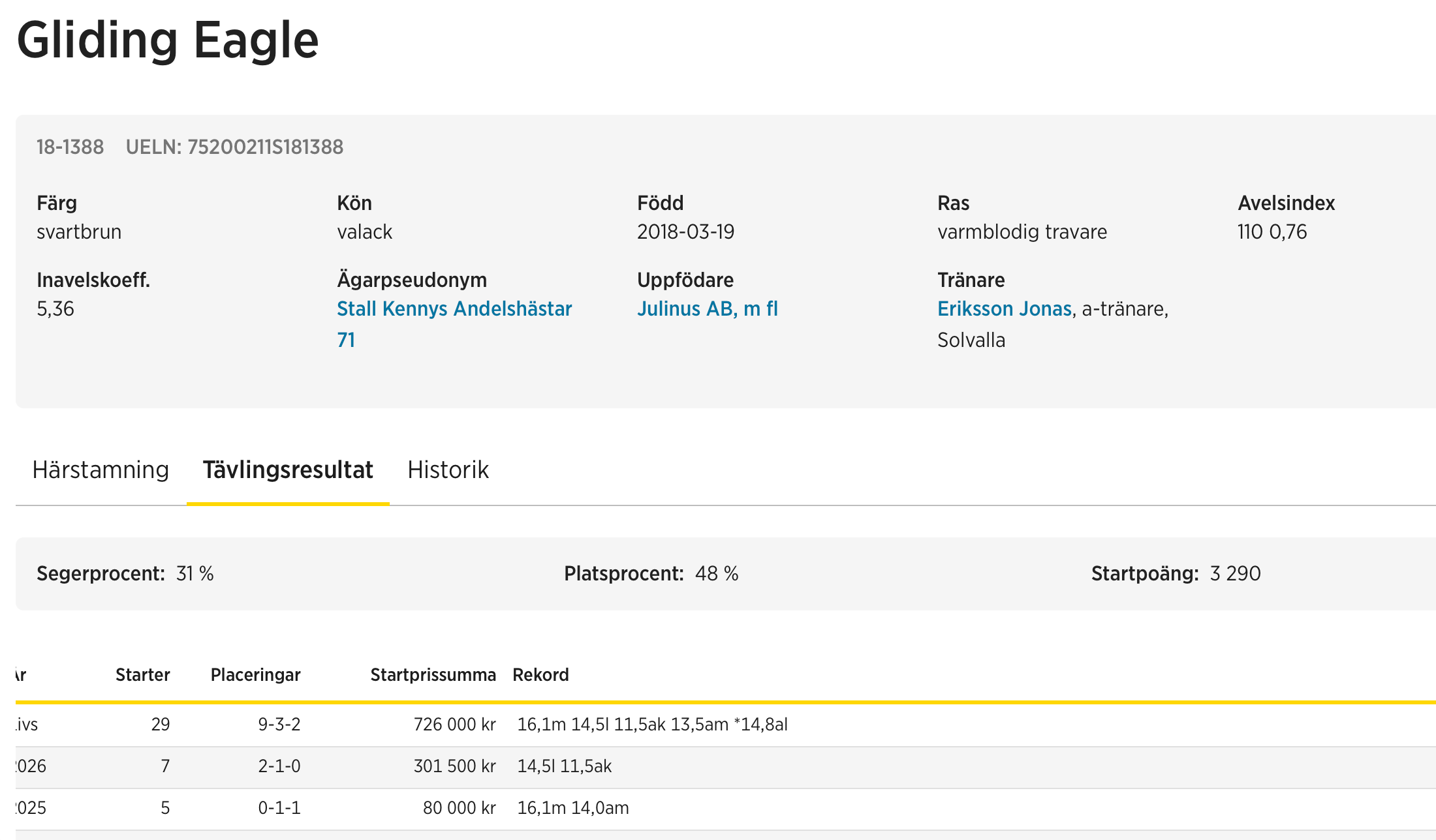 Gliding Eagle har vunnit nio lopp på 29 starter och tjänat 726 000 kronor.
