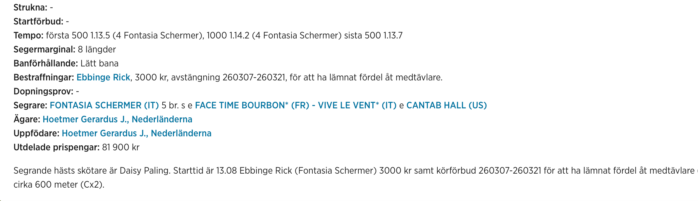 Rick Ebbinge kom behändigt till spets med spelfavoriten Fontasia Schermer. Men efter drygt 500m väljer Ebbinge att släppa fram stallkamraten Eos Font för att sedermera gå ut och överta igen dryga varvet kvar till mål. Experterna i TV12 var inte nöjda med Ebbinges manöver.