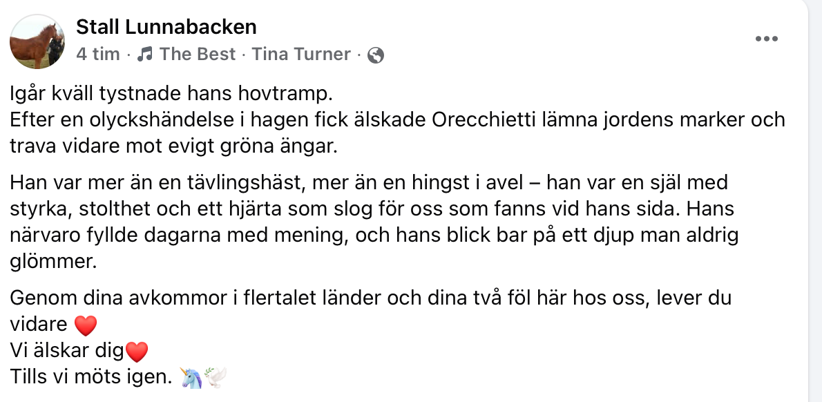 – Efter en olyckshändelse i hagen fick älskade Orecchietti lämna jordens marker och trava vidare mot evigt gröna ängar, skriver Stall Lunnabacken.
