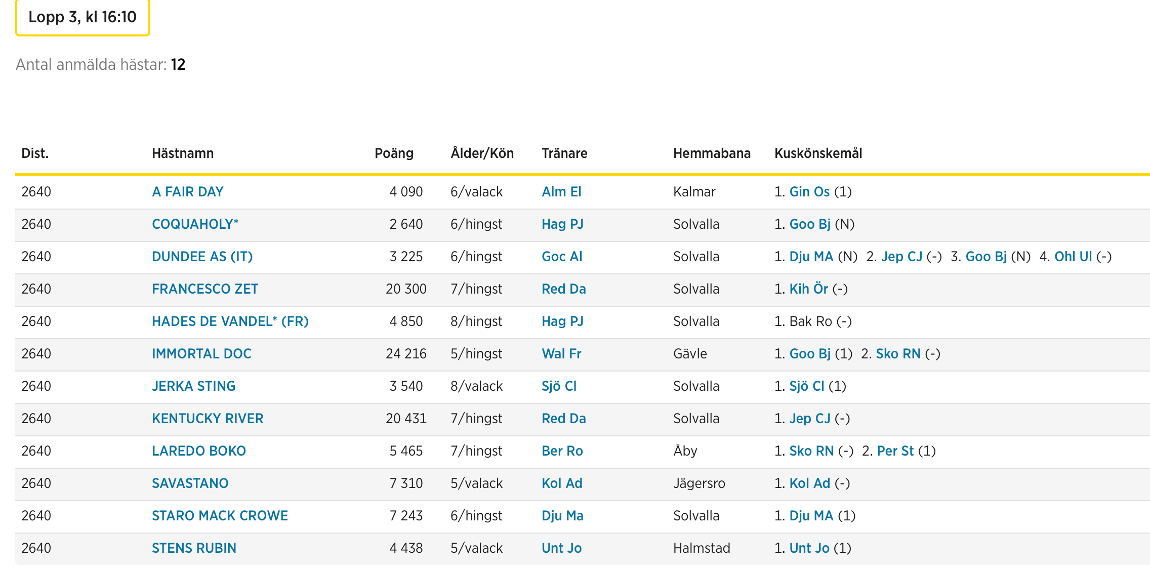 Även A Fair Day finns med i fältet – den folkkära travaren som vanligt körd av Oscar Ginman och tränad av Elisabeth Almheden.
