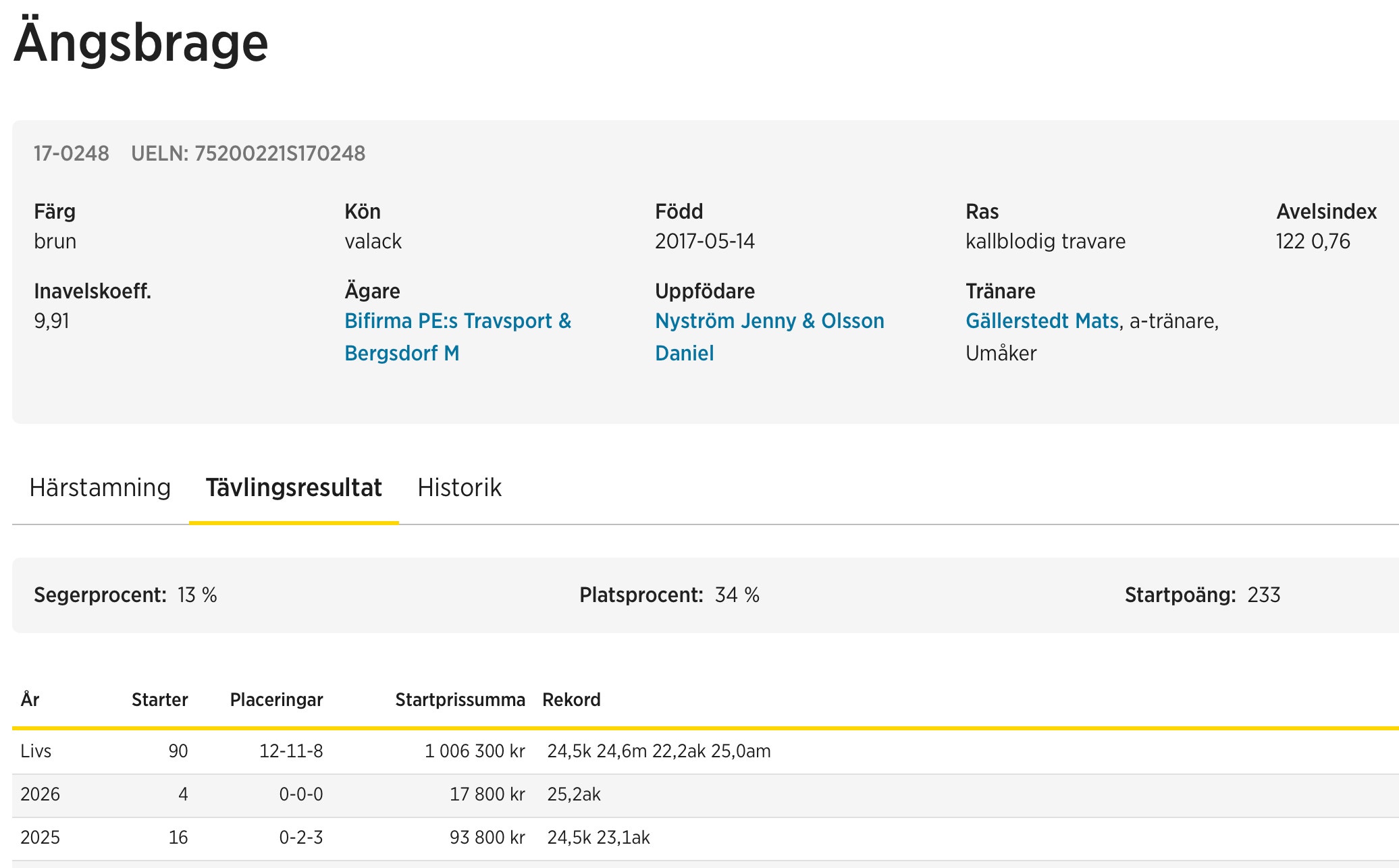 Ängsbrage har på 90 startar tagit hem tolv segrar och sprungit in 1 006 300 kronor.