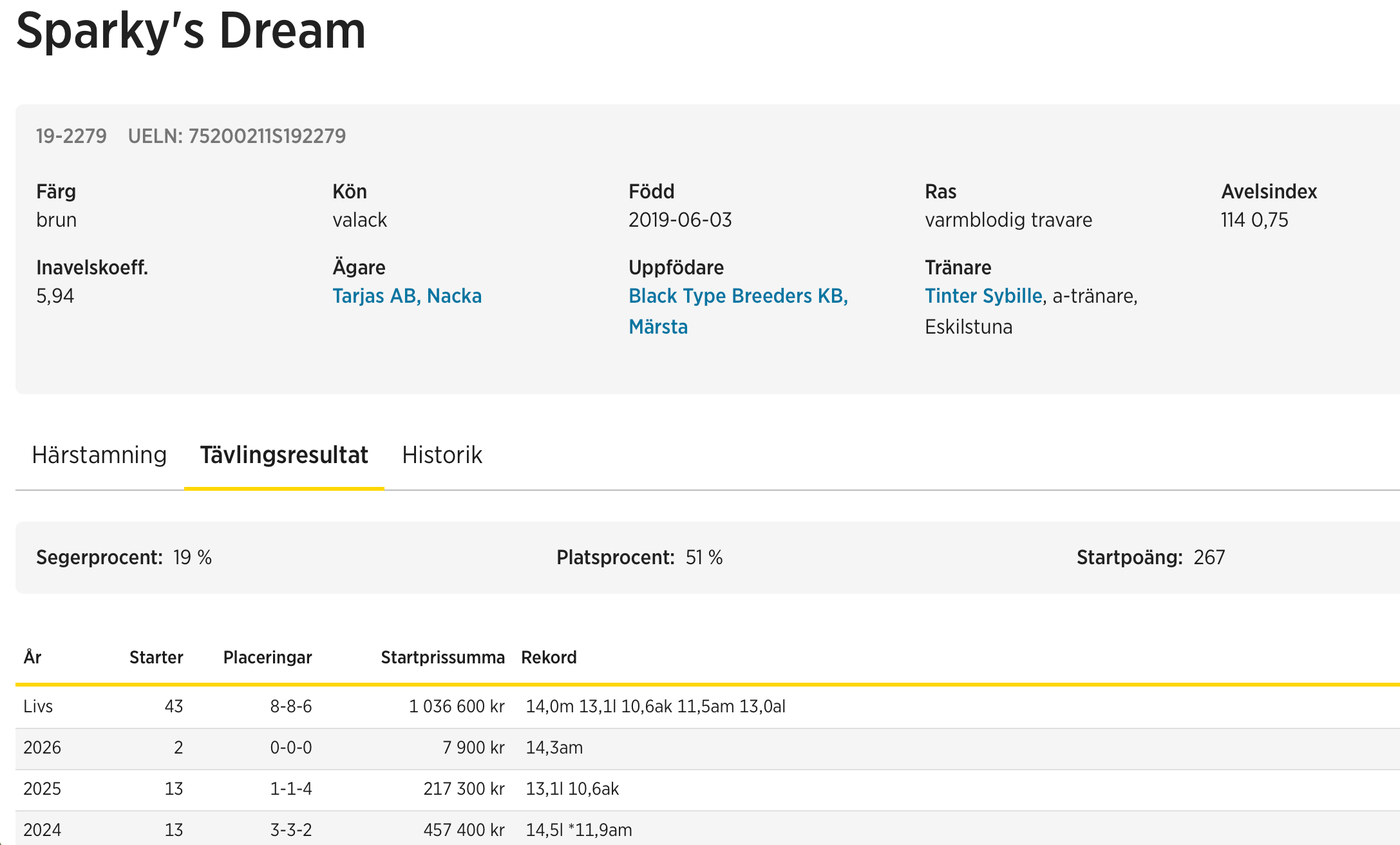 I år har hästen startat två gånger där det blivit en femteplats som bästa resultat och nu har ägaren Tarjas AB valt att flytta hästen från Anders Eriksson till Sibylle Tinter.