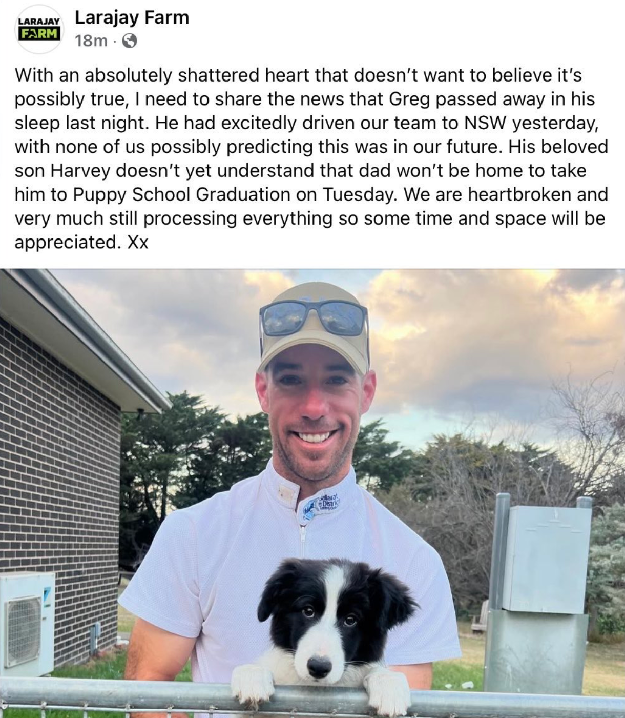 Australiensiske Greg Sugars gjorde ett mycket uppskattat besök i Sverige med hästen Just Believe och blev direkt ett omtyckt ekipage. Nu på förmiddagen kom chockbeskedet att han har gått bort. Detta meddelar Larajay Farms.