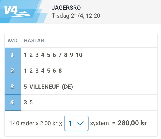 5 Villenuef är tillbaka i Sverige och gjorde bra lopp här senast. Står billigt inne. Spikförslag i omgången.