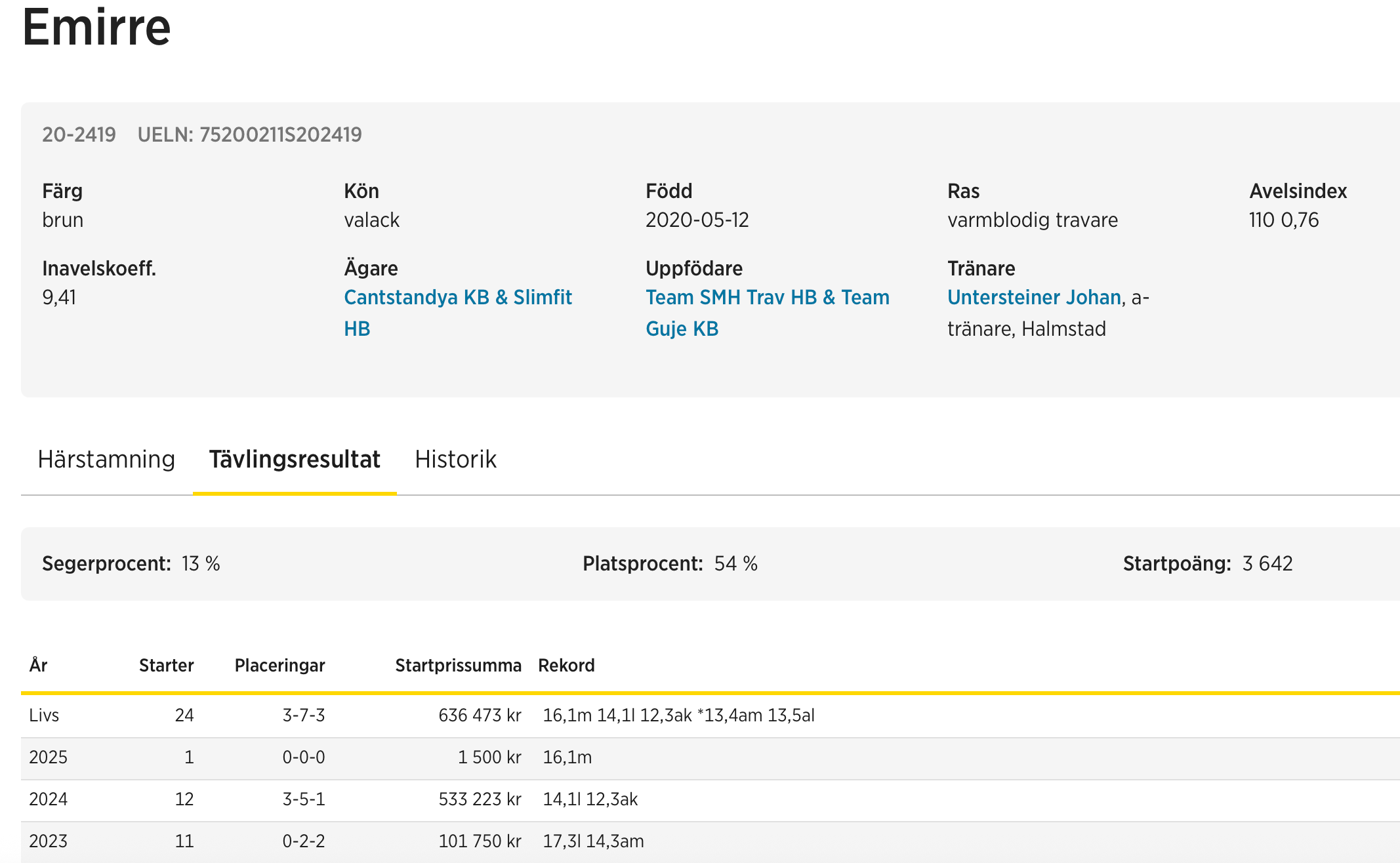 Emirre har vunnit tre lopp på 24 starter och sprungit in 636 473 kronor.
